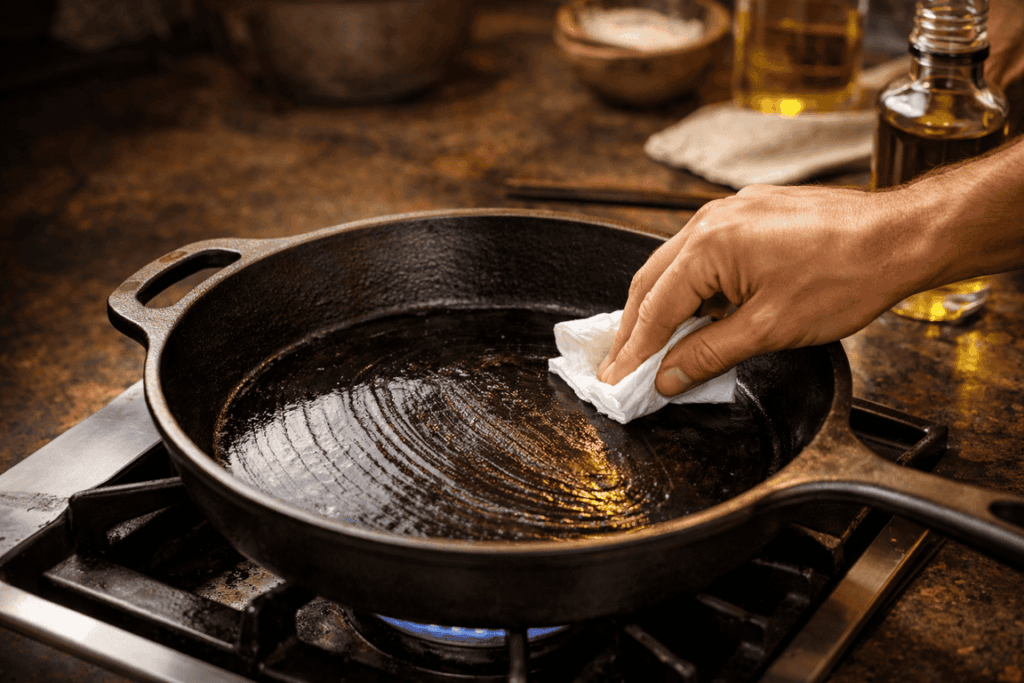 Ao entender como curar panela, você percebe que o óleo aquecido forma uma camada antiaderente natural.